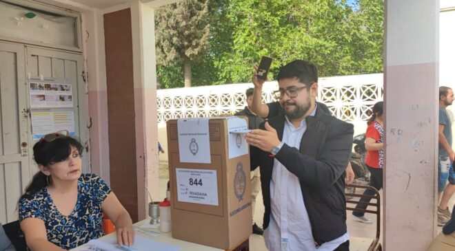 El candidato al Parlamento del Mercosur (Parlasur) por Unión por la Patria Matías Sotomayor, votó en la escuela Diógenes Perramón, en La Bebida, Rivadavia.
