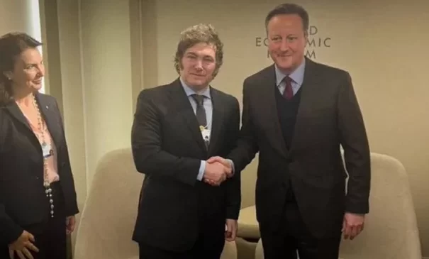 Con el foco puesto en el tema de las Islas Malvinas y el FMI, el presidente Javier Milei se reunió con el canciller británico, David Cameron en Davos.