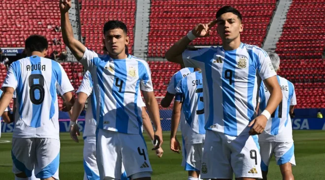 La Albiceleste dominó el trámite desde el comienzo en el Estadio Nacional de Santiago por el gol de Alejo Sarco al minuto de juego. Maher Carrizo amplió distancias con un doblete y Mateo Silvetti, que ingresó desde el banco, puso cifras definitivas en el complemento.