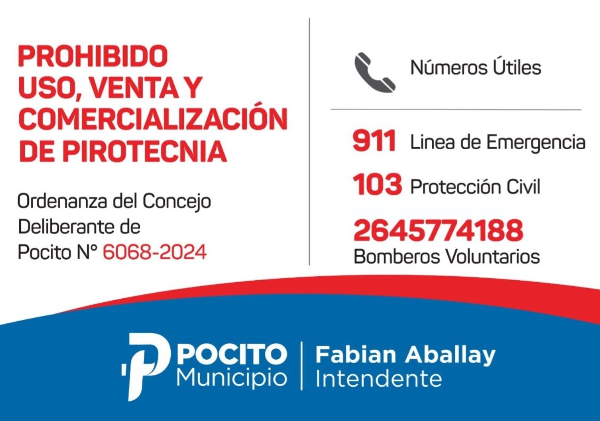 La Municipalidad de Pocito recuerda que, con motivo de acercarse las fiestas de fin de año, está prohibido en el departamento el uso, la venta o comercialización de todo tipo de pirotecnia.